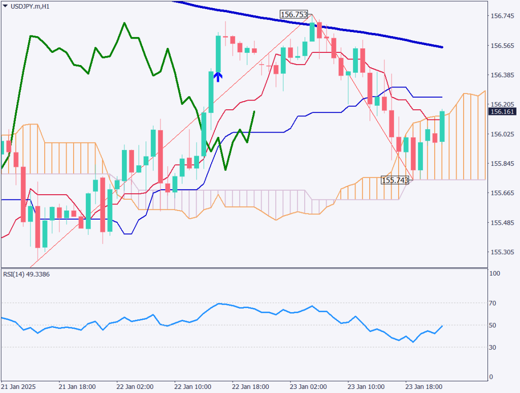 ドル円の1時間足チャートを分析する。ドル円の1時間足のRS胃は48となっており、50を上回ることができていない。下落基調を示す水準だ。本日の利上げによって、上昇連弩ラインを割り込めば、240移動平均線が推移する152.65円まで瞬間的に下落する可能性がある。