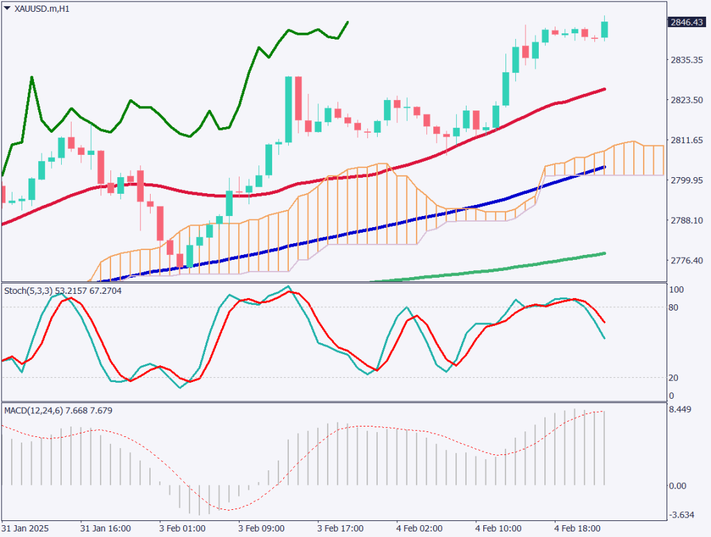 ゴールドの日足チャートを分析する。ゴールドは連日、史上最高値を更新している。2800ドルを上抜けた後、2848ドルまで急騰。関税政策の不透明感、カナダでの反発の動きなどが影響しており、株式市場は消化しつつも、リスク回避の動きが強まっている。