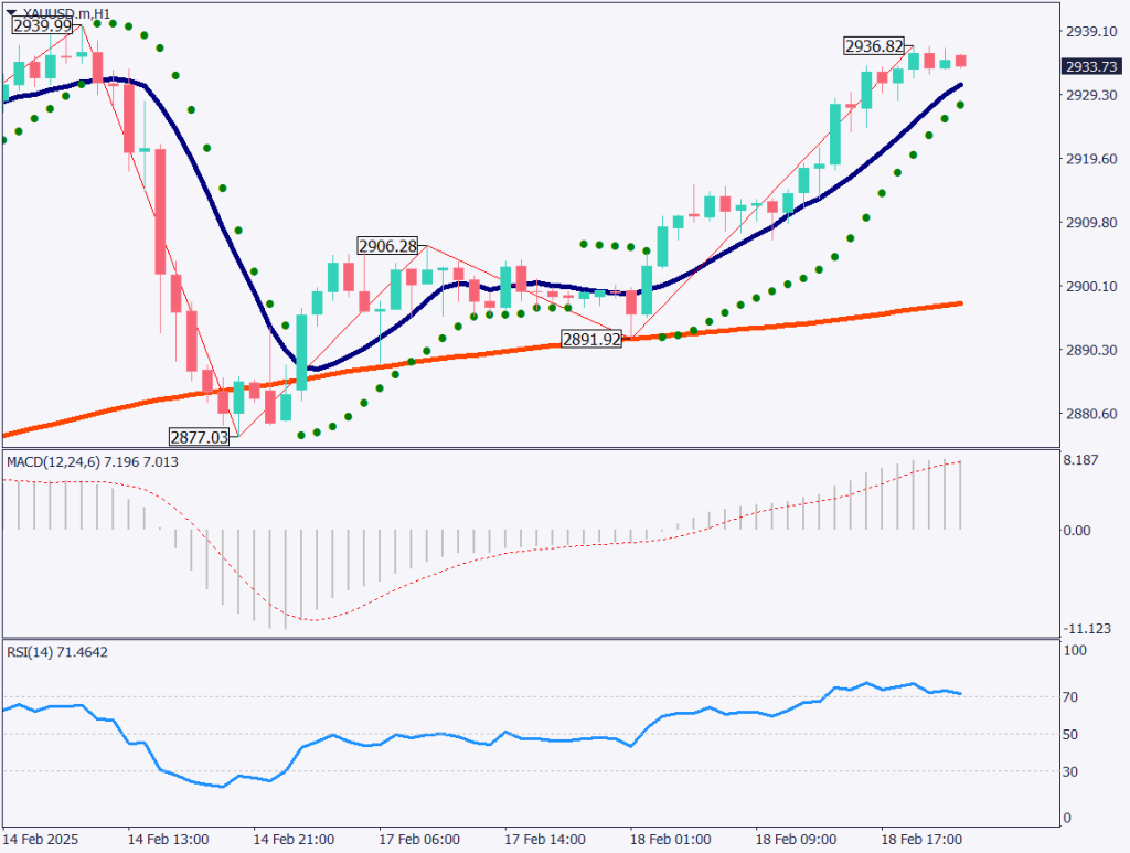 ゴールドの1時間足チャートを分析する。ゴールドは200移動平均線で反発した後、2936ドルの高値を付けた。高値圏での推移が継続しており、RSIも71となっている。上昇基調が強い。
